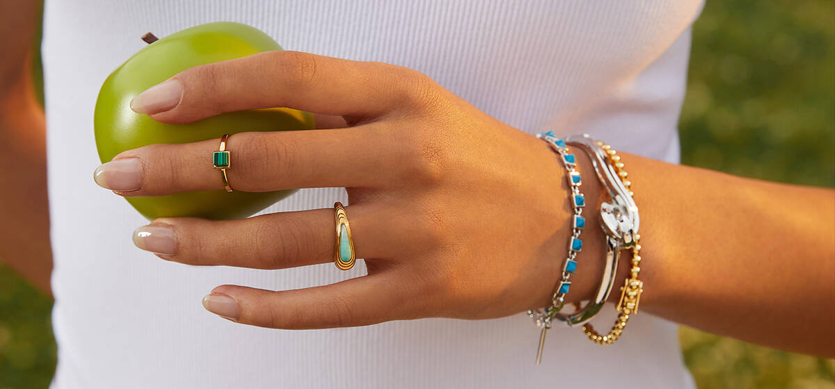 Yes, the more, the merrier. It’s all about experimenting and curating the perfect ring stack. So let your hands be under the style spotlight. Don’t overthink – space out different styles and play with proportions. When in doubt, seek out complementary colour families – grouping rings with warmer-toned gemstones and metals together, or pairing cool, aquatic-hued jewels with bands of pearls and white gold.