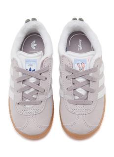 Crafted for comfort and style, these adidas Gazelle sneakers for kids feature a soft grey suede upper adorned with whimsical embellishments like a carrot detail. The contrasting white stripes and gum sole offer a classic touch, while the plush lining ensures extra coziness.