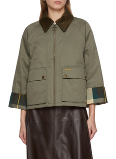 This Barbour jacket is a testament to timeless style and durability, featuring a classic zip front with a plush contrast collar and utility pockets for functionality. Its distinctive cuff detailing with tartan accents lends a touch of heritage flair.