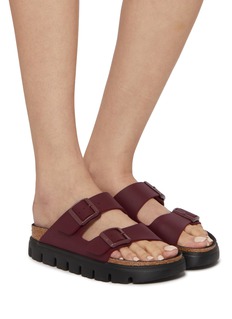 The classic Arizona silhouette is elevated with a bold, treaded sole for contemporary impact. Defined by double straps and tonal buckles in deep zinfandel red, this design balances heritage ease with a modern statement edge—perfect for city strolling or casual weekend looks.