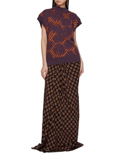 Dries Van Noten lends graphic rhythm to this jacquard sweater vest, woven in a warm wool–viscose blend. The abstract rose motif and diagonal striping create a layered visual depth, ideal for pairing with fluid skirts or tailored trousers to elevate everyday edits.