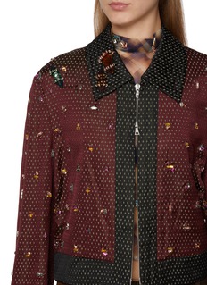 Dries Van Noten fuses opulence with structure in this cropped jacquard jacket. Embellished with multicolour strass and sculptural brooch details, the geometric motif base contrasts its jewel-like surface. A statement layer, it elevates denim by day and tailored trousers by night.