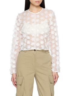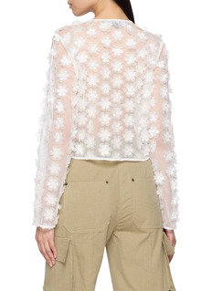 This sheer cardigan by EPINGLER flourishes with three-dimensional floral embroidery, creating a poetic balance between transparency and texture. Its cropped, lightweight design adds a touch of ethereal romance—perfect for layering over a camisole or slip dress for soft, modern allure.