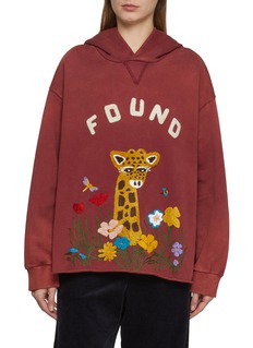 In FOUND’s universe of memory and imagination, this hoodie captures a sense of childhood wonder through a hand-embroidered giraffe surrounded by wildflowers and a chenille logo across the chest. Vintage-treated cotton and a sun-faded wash evoke the warmth of a treasured, time-worn piece.