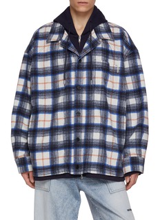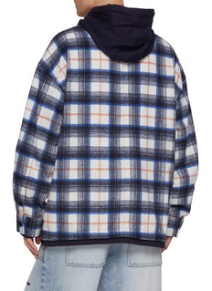 Juun.J fuses streetwear codes with tailored craftsmanship in this layered flannel shirt. Rendered in a blue and ivory chequered wool blend, it features a built-in cotton hood that adds depth and contrast to the silhouette. The relaxed proportions and tactile surface channel the label’s architectural ease — ideal for layering with denim or technical trousers for a casual yet refined statement.