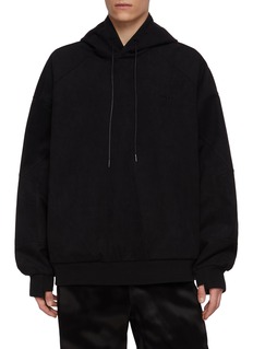 Cut from supple faux suede, this pullover hoodie by Juun.J embodies the label’s architectural minimalism. The oversized silhouette and raglan sleeves balance softness with structure, while the hidden side pockets enhance its clean, uninterrupted form. A tonal logo embroidery subtly finishes the piece — a versatile layer that transitions effortlessly from streetwear to elevated casual looks.