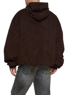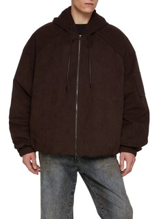 Crafted from rich faux suede, this oversized zip-up hoodie from Juun.J embodies the label’s architectural ease. The velvety texture enhances its sculptural volume, while the raglan sleeves and elasticated hem lend a relaxed yet directional edge. Perfect for layering over tonal separates to achieve an understated, contemporary silhouette.
