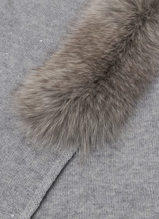 Lane’s knitted shawl embodies quiet sophistication in soft grey. Spun from a fine wool and cashmere blend, its surface is delicately dusted with tonal sequins that shimmer subtly in motion. Finished with a voluminous fox fur collar, it makes a refined statement for cool-weather layering.