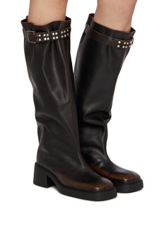 A bold reimagining of the biker classic, Miista's Kristel boot balances structure and fluidity. The square toe and stacked heel ground the look, while supple brushed leather slouches into shape, cinched by raw-edged studded belts. A rich patina promises depth that only grows with wear—perfect with oversized coats or a sharp mini.