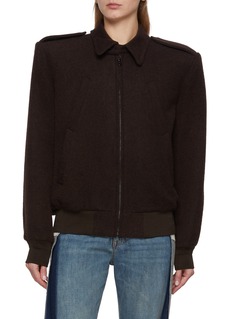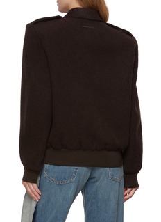 Sleek sophistication meets urban edge. This MM6 Maison Margiela bomber jacket features bold shoulders, a tailored collar, and a minimalist zip-front, blending modern structure with effortless style. Perfect for making a statement.