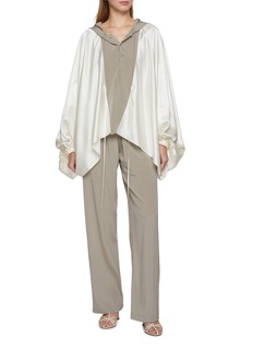 An expression of fluid modernity, this blouson top by Sharon Wauchob reveals the brand’s signature elegance through its billowing drape and tie-front detail. The soft, liquid sheen and sculptural sleeves evoke quiet movement—ideal for evening refinement or effortless layering.