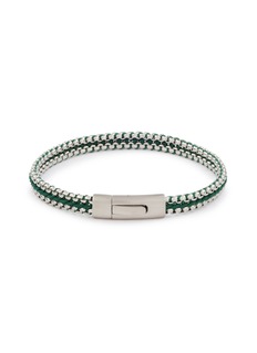 Elevate your style with the Tateossian Silver & Green Woven Bracelet. This meticulously crafted piece features a vibrant green textile cord interwoven with gleaming sterling silver chains, creating a striking visual contrast. The secure clasp ensures a comfortable fit, making it a perfect accessory for both everyday wear and special occasions.
