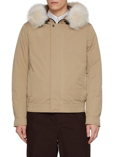 A modern reinvention of outerwear luxury, this Yves Salomon blouson fuses utilitarian edge with exquisite craftsmanship. The sleek cotton-blend shell conceals a plush rabbit fur lining and coyote-trimmed hood, offering both warmth and sophistication for winter city wear.